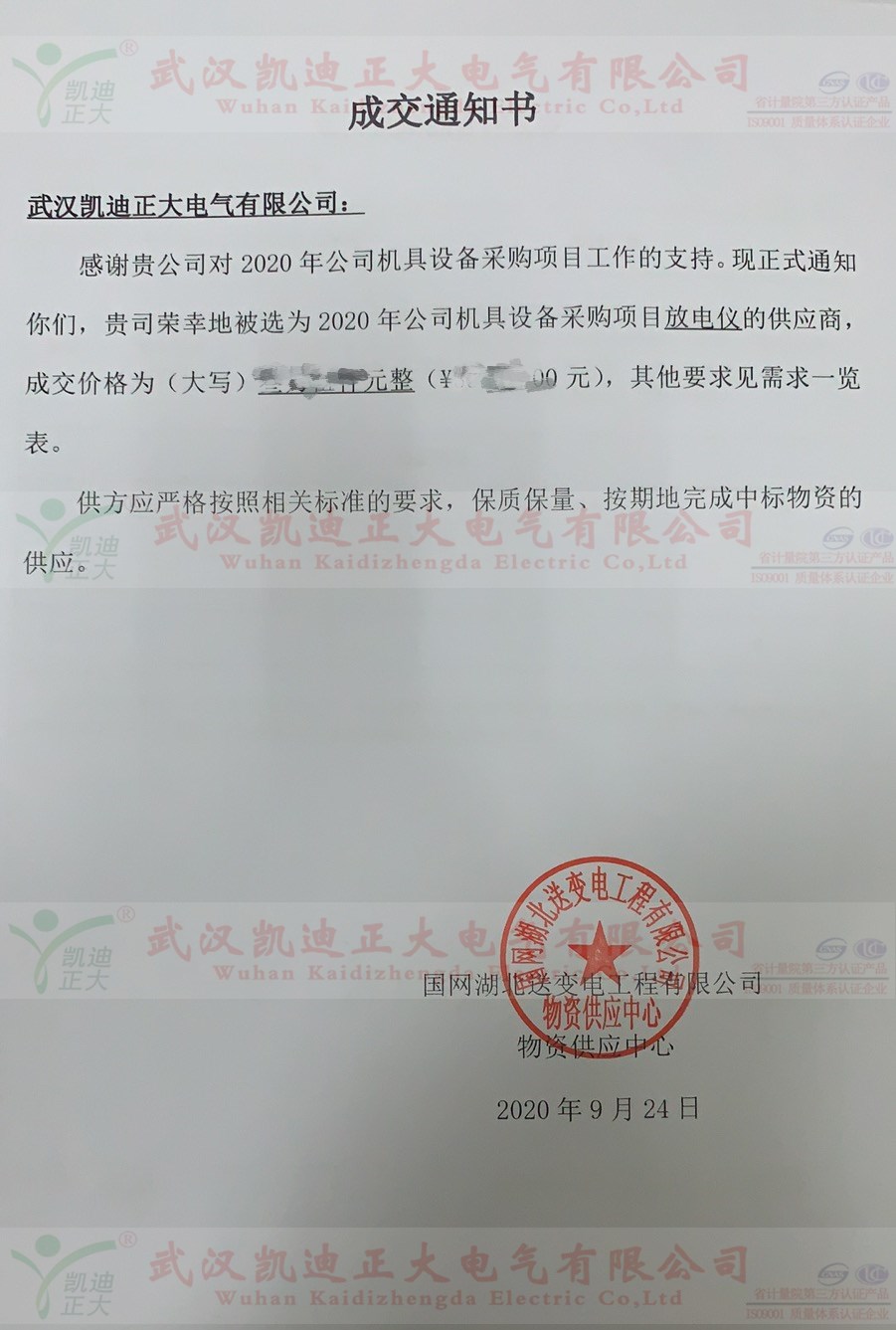 祝賀獲得國網湖北送變電公司蓄電池放電儀成交通知書