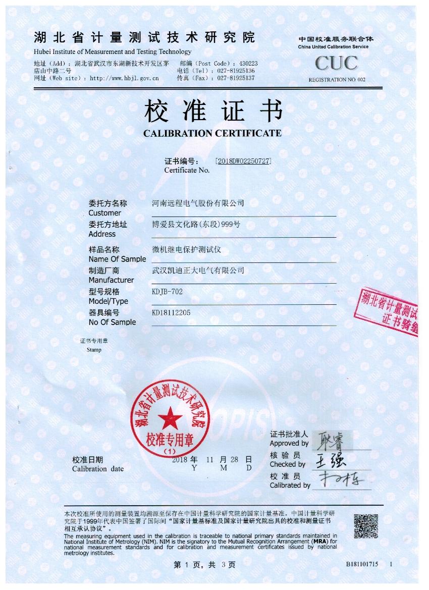 湖北省計量測試技術研究院是政府計量行政管理部門依法設立的法定計量檢定機構,本次校準的技術依據是參照JJG 1112-2015繼電保護測試儀,校準所使用的主要計量設備數字多用表,型號/編碼:8508A,校準環境溫度20.2度,相對濕度40度,校準數據結果符合國家電力預試設備標準。