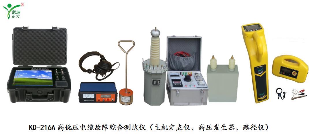 KD-216B 電纜故障測試系統迎合電力工業快速發展需求和設備人性化設計要求,采用了國際最高水平的時域反射技術,故障波形自動判距、自動顯示故障距離、簡單明了,解決了傳統電纜故障測試儀依靠人去分析故障距離的缺點,使用方便快捷;整機采用進口防水、防潮、防震、防腐工業級機箱,適用于任何環境測試。主要元器件選擇性能優異的進口元器件,產品小巧精致,易于攜帶,設備性能優于行業水平;全新的軟件操作平臺,人機界面友好,即使非專業人員操作,依然可以很快熟悉并使用,高效、準確的完成電纜故障測試工作。整套系統滿足中華人民共和國電力行業標準《DL/T849.1~ DL/T849.3-2004》電力設備專用測試儀器通用技術條件,生產遵循中華人民共和國制造計量器具許可證陜制00000548號,該套設備由電纜故障測試儀主機、故障定位電源、高壓電橋故障定位系統三部分組成,適用于35kV及以下不同電壓等級電力電纜故障定位。