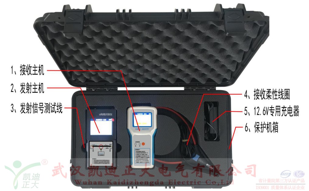KD-214A帶電電纜識別儀(以下簡稱識別儀)是用于將某一特定電纜從一束電纜中識別出來的專用儀器。它即能識別停電電纜,也能識別帶電電纜,滿足了電力施工現場對電纜識別的多重需求。識別儀主要由發射主機、接收主機、發射連線、發射卡鉗與柔性測量線圈構成。識別儀的設計相比上一代產品更加緊湊小巧,攜帶方便,具有如下特點: