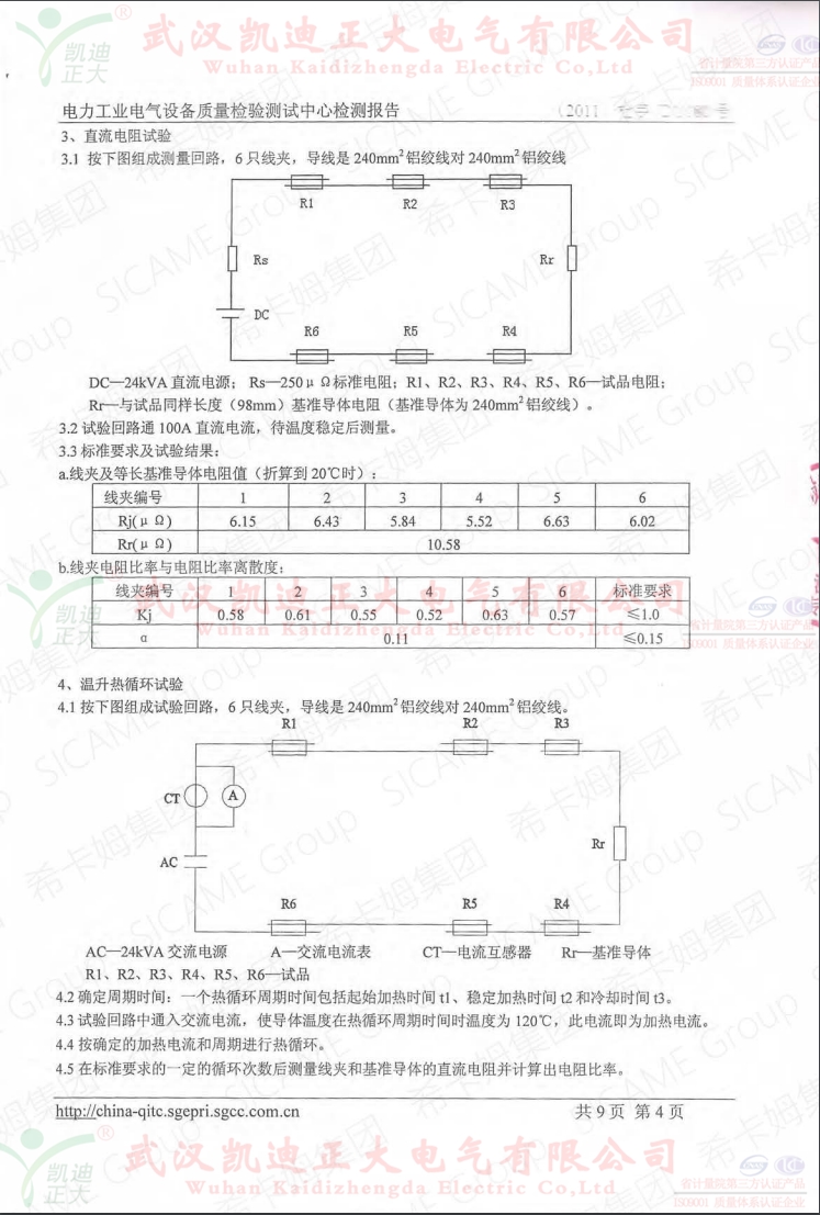 法國希卡姆集團全資注冊的希瑪電力設(shè)備公司,2011年6月在武高所電力工業(yè)電氣設(shè)備質(zhì)量檢驗測試中心檢定H型線夾。檢測結(jié)論:根據(jù)DL/T765.1-2001對希瑪電力設(shè)備送檢的HC650型H形線夾進行了尺寸和外觀檢查,結(jié)構(gòu)和組裝檢查,直流電阻試驗、溫升試驗、熱循環(huán)試驗、短路電流試驗和握力試驗,檢測項目合格。