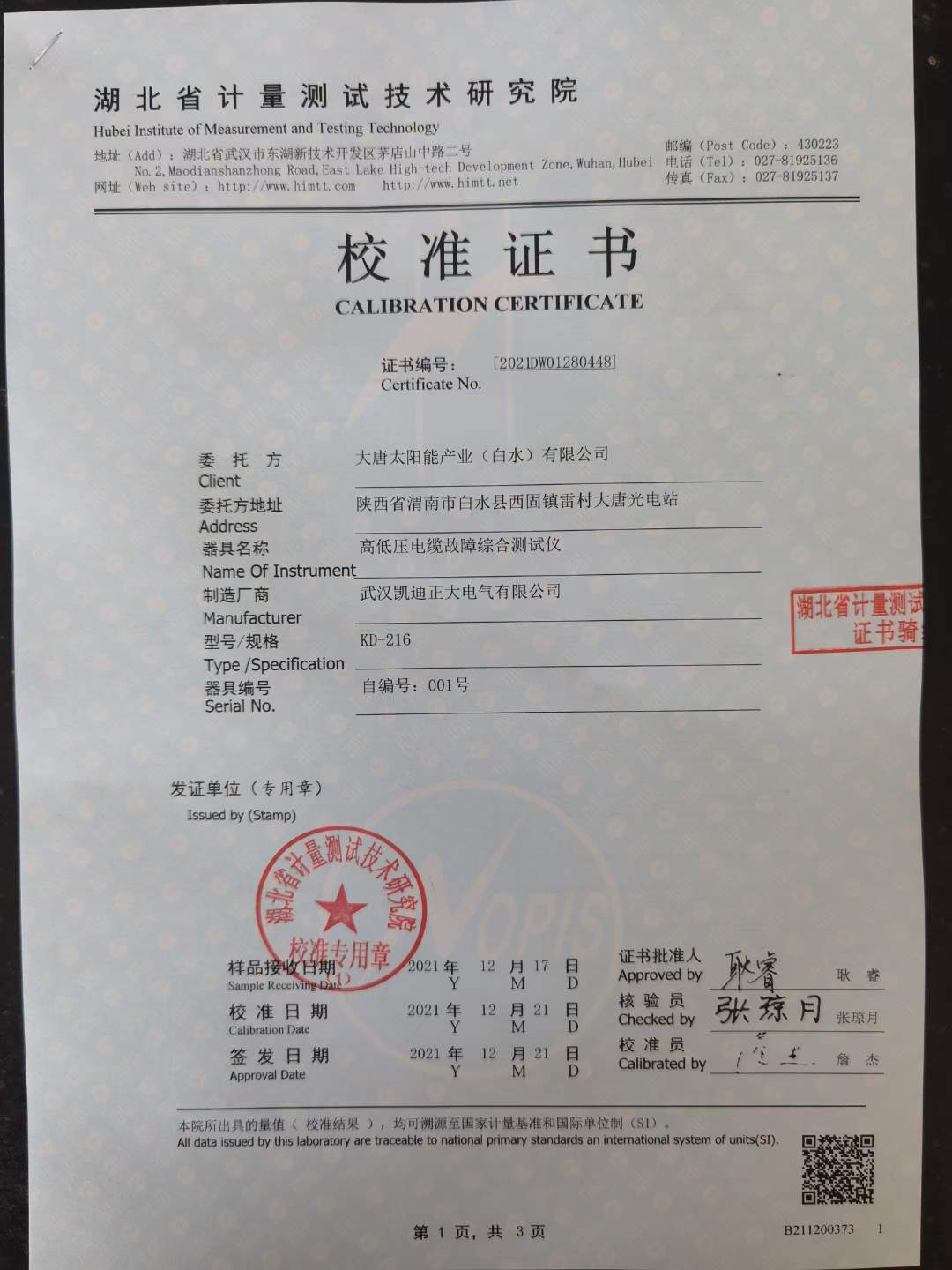 2021年12月22日,大唐太陽能產(chǎn)業(yè)(白水)有限公司采購我公司一批高低壓電纜故障綜合測試儀。為彰顯本公司產(chǎn)品的實力與質(zhì)量,凱迪正大雷總攜帶本公司生產(chǎn)的KD-216高低壓電纜故障綜合測試儀前往湖北省計量測試技術研究院中南國家計量測試中心對產(chǎn)品進行檢測,經(jīng)過多次測量與檢測后,產(chǎn)品完整通過每一條檢測并獲得了校準證書。