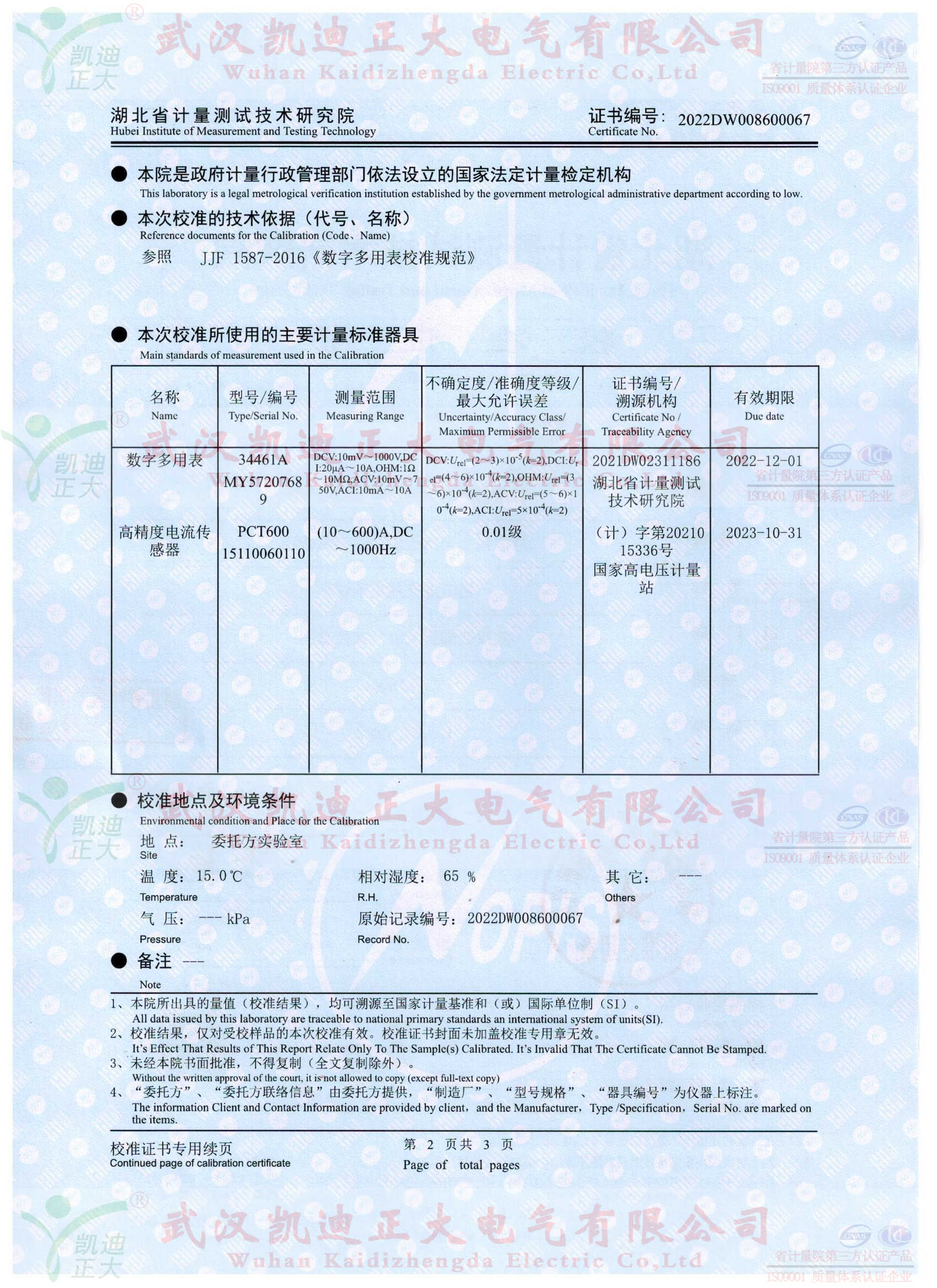 生產KDZD886完成后,送往省計量院。在校準證書顯示:采用國家高電壓計量站(計)字第2021015336號溯源機構的高精度電流傳感器及數(shù)字多用表檢定電壓示值誤差U=0.2V;電流值U=0.1A的結果值,符合國家相關標準,滿足測量不確定度。" />
