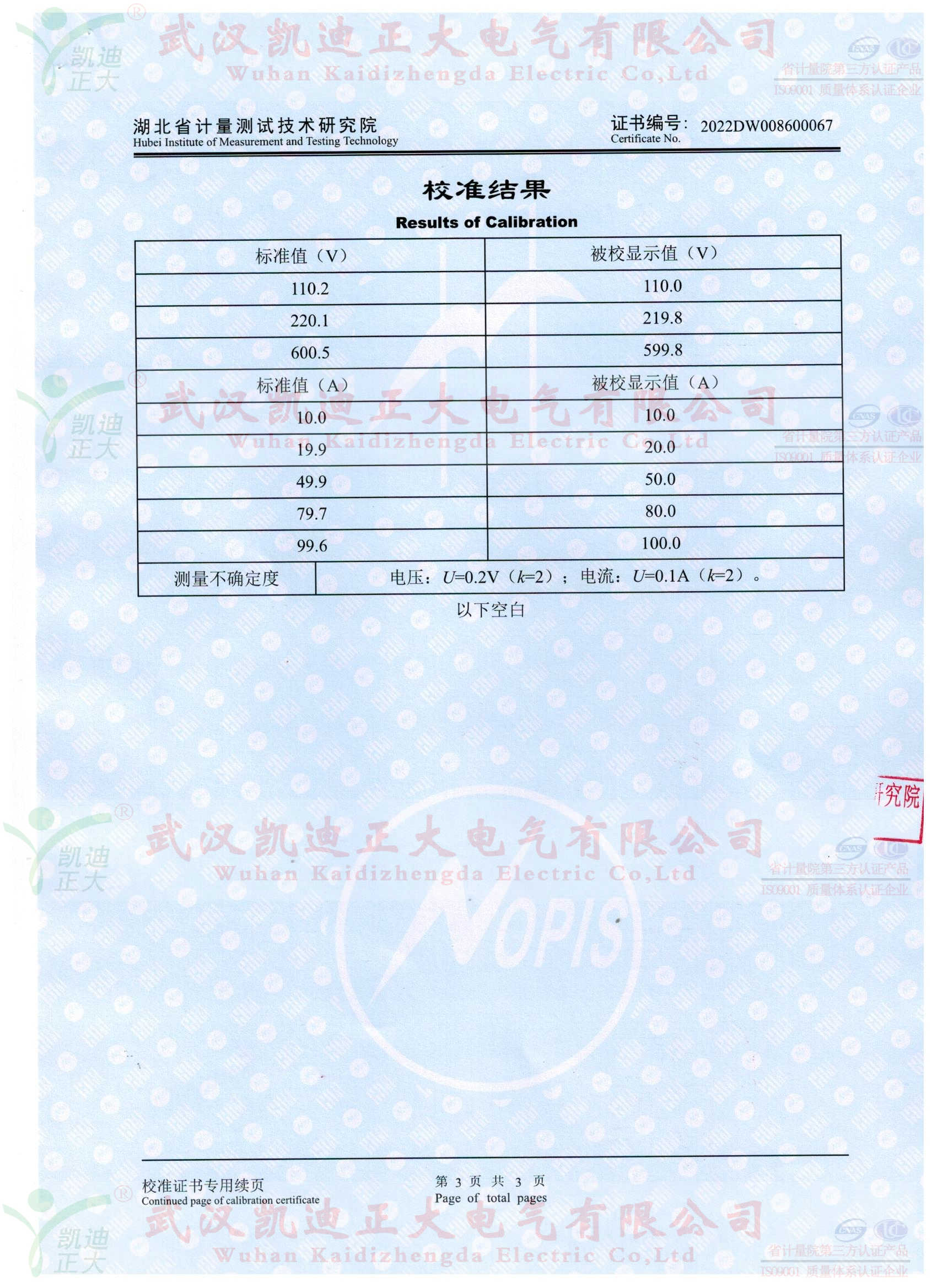 生產KDZD886完成后,送往省計量院。在校準證書顯示:采用國家高電壓計量站(計)字第2021015336號溯源機構的高精度電流傳感器及數(shù)字多用表檢定電壓示值誤差U=0.2V;電流值U=0.1A的結果值,符合國家相關標準,滿足測量不確定度。