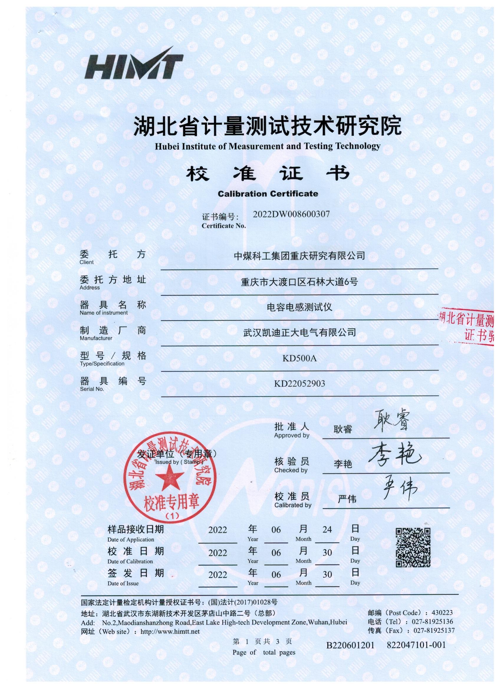 2022年6月底,中煤科工集團(tuán)重慶研究有限公司在我司采購一批電容電感測試儀,并要求我方提供第三方產(chǎn)品檢驗證書。