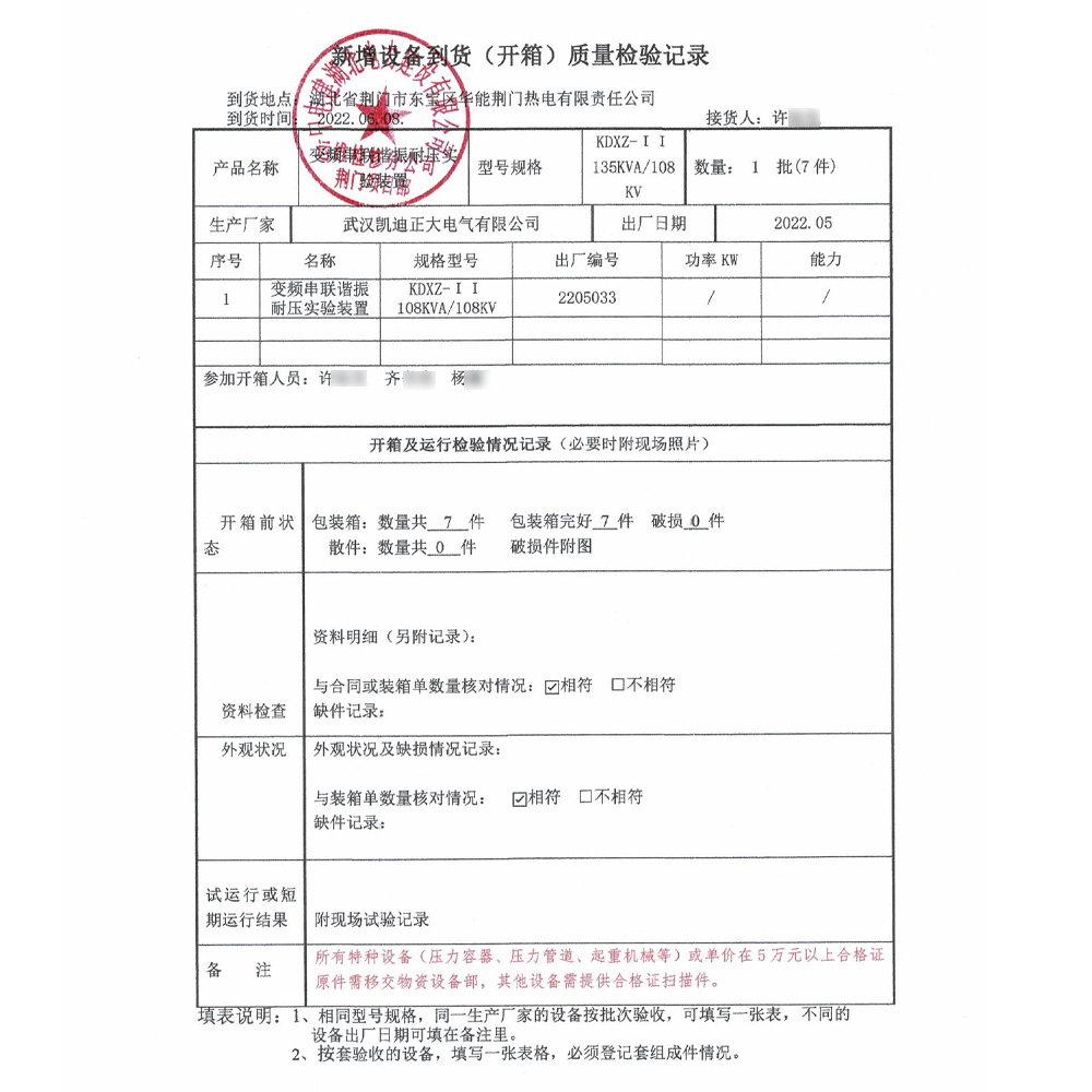2022年6月初,華能荊門熱電有限公司采購凱迪正大電氣一批熱電廠電氣試驗設(shè)備,其中KDXZ-135kvA/108kV變頻串聯(lián)諧振耐壓試驗裝置已經(jīng)順利到貨,實發(fā)數(shù)量7件,實收數(shù)量7件。由中國電建湖北運維檢修公司荊門項目部許工負責驗收,火紅的電抗器顏色格外顯眼。許工和齊工一起對設(shè)備進行清點,仔細對比了湖北省計量院出具的計量檢測報告,對比現(xiàn)場升壓試驗精度,表示認可滿意。