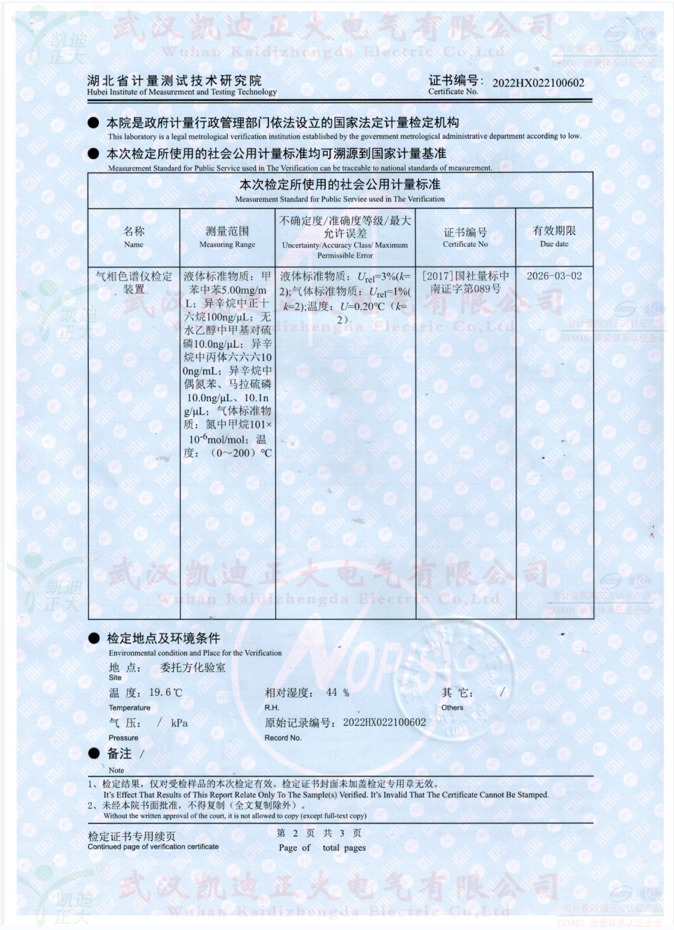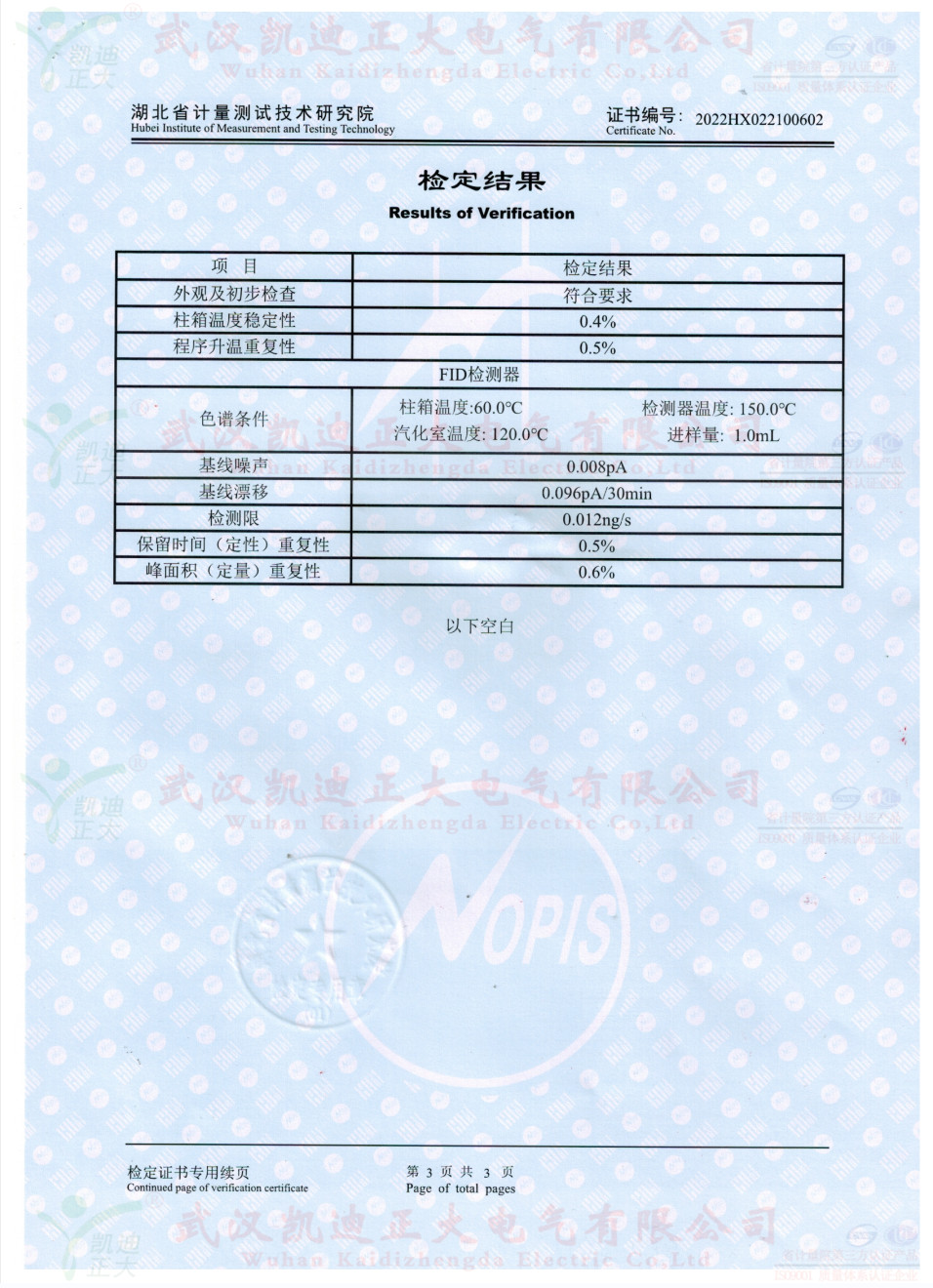 獲得國網(wǎng)湖北省電科院蔡工的青睞,了解了色譜儀的性能后,要求設(shè)備獲得湖北省計(jì)量院檢定報(bào)告。2022年10月,我司生產(chǎn)好KDZD9560氣相色譜儀后,按照J(rèn)JG700-2016《氣相色譜儀檢定規(guī)程》進(jìn)行送檢,檢定結(jié)果為合格。送檢單位電力工業(yè)電氣設(shè)備質(zhì)量檢驗(yàn)測試中心,計(jì)量器具KDZD9560氣相色譜儀符合相關(guān)標(biāo)準(zhǔn)。