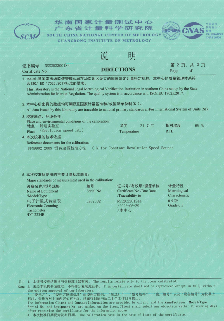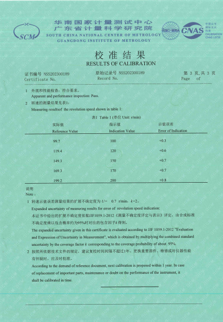 參照FFN9902-2009 恒轉(zhuǎn)速源校準方法 C.M.for Constant Revolution Speed Source 檢定要求,CY3恒速器(恒轉(zhuǎn)速源)獲得NSS202300189檢定證書。