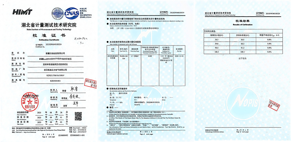 近期,新疆某能源公司采購了由‌武漢凱迪正大電氣有限公司生產的‌KDXZ-270kVA/108kV變頻串聯諧振試驗裝置。該設備經湖北省計量測試技術研究院(省計量院)校準并頒發證書(證書編號:2025DW049100324),此次校準不僅標志著該設備各項性能指標符合行業規范要求,更凸顯了武漢凱迪正大在高壓電氣檢測設備領域的技術實力。