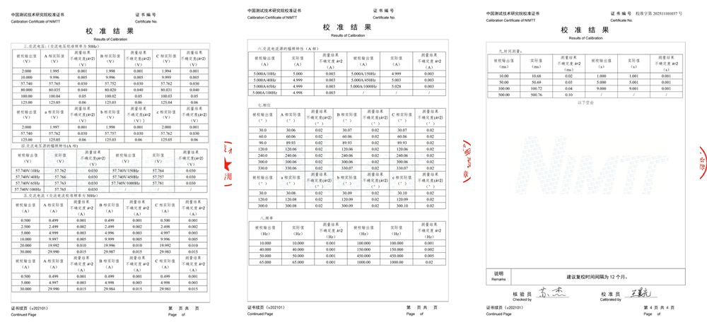 校準內容全面覆蓋了繼電保護測試儀的所有核心功能,具體結果彰顯了儀器的高精度與穩定性: