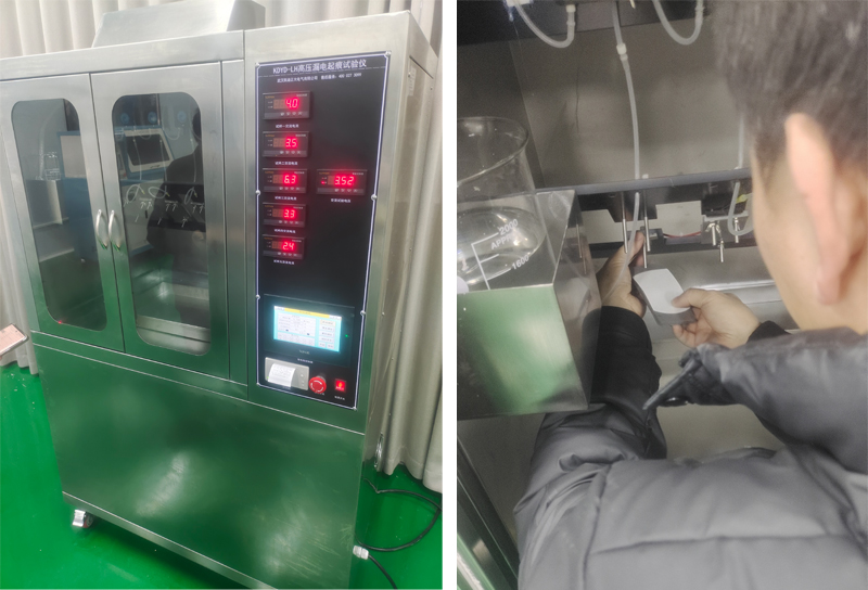 接下來(lái),技術(shù)人員對(duì)設(shè)備的整體結(jié)構(gòu)和工作原理進(jìn)行了介紹。結(jié)合實(shí)物,指出了高壓發(fā)生單元、精密滴液系統(tǒng)、五組獨(dú)立測(cè)試單元以及智能控制核心等主要部分的位置與功能。解釋了設(shè)備如何在標(biāo)準(zhǔn)規(guī)定的電壓下,通過(guò)控制污染液滴落的間隔與流速,來(lái)監(jiān)測(cè)材料的泄漏電流變化,并最終依據(jù)電流值與持續(xù)時(shí)間對(duì)材料的耐電痕化等級(jí)做出判定。